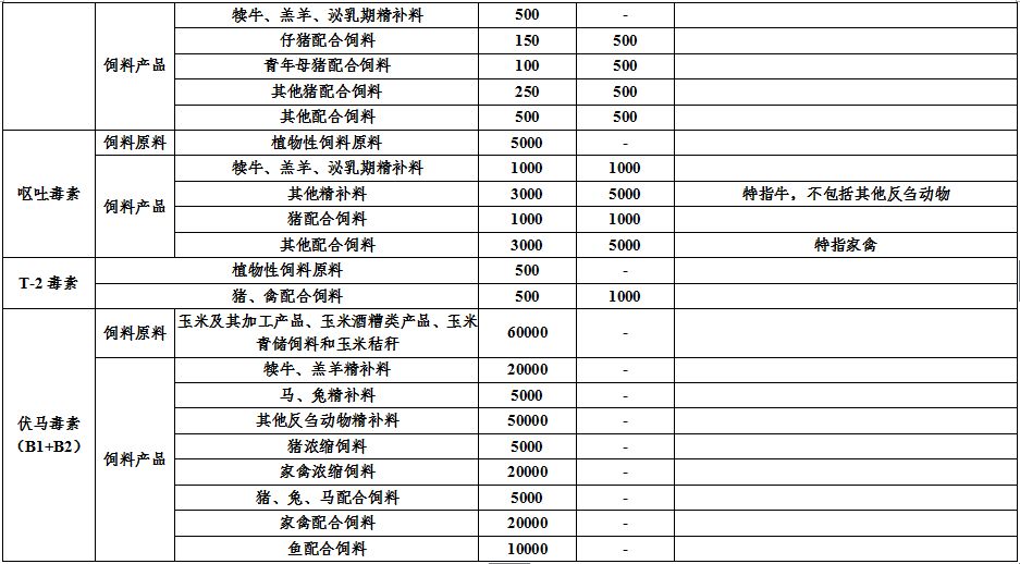 原標(biāo)準(zhǔn)詳細(xì)規(guī)定了黃曲霉毒素在飼料原料和產(chǎn)品上的限值,粗略規(guī)定了其他4種毒素在飼料原料或產(chǎn)品上的限值。