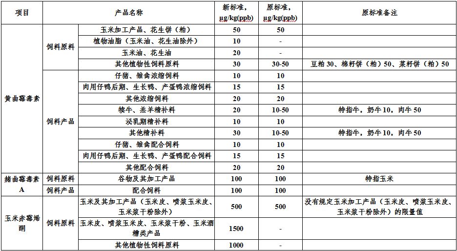 表 新舊標(biāo)準(zhǔn)對(duì)飼料中霉菌毒素的限量要求