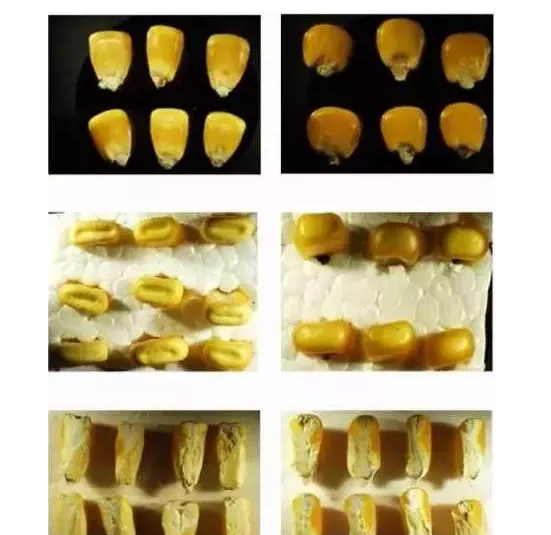 Colloid corn big full, more difficult to crush, broken is broken after granular, and granularity evener, taste bad, but the riboflavin content is higher, suitable for birds, especially the layers of material.