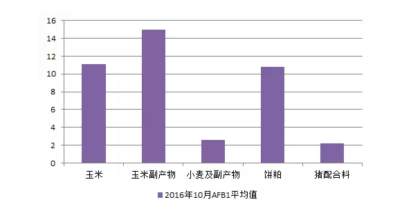 由圖1可以看出,2016年10月玉米和餅粕原料的黃曲霉毒素平均值超過了10μg•kg-1,有3份玉米黃曲霉毒素都超過了30μg•kg-1,污染十分嚴重;黃曲霉毒素B1污染范圍廣,污染率極高。從歷史數據來看(圖2),2016年10月玉米、餅粕以及玉米副產物黃曲霉毒素比上月均有上升趨勢,養殖戶和飼料廠需要提高對該三類原料黃曲霉毒素污染情況的關注。